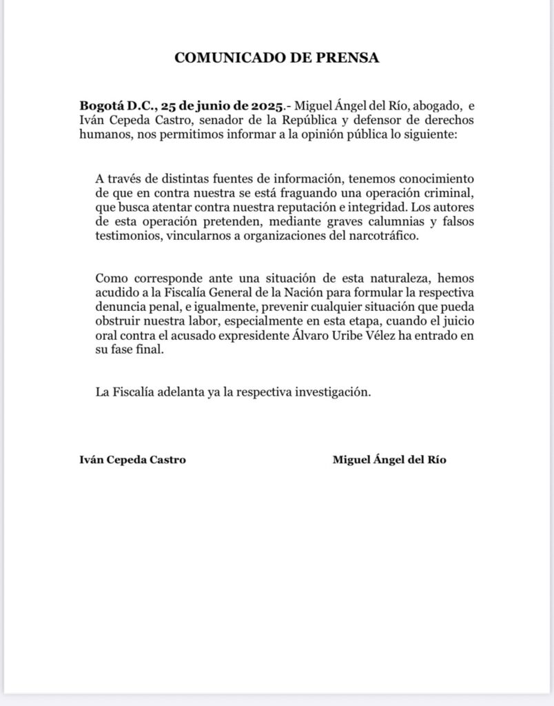El senador Iván Cepeda y el abogado, Miguel Ángel del Río, a través de un comunicado manifestaron su preocupación por que, al parecer, «se estaría fraguando un intento por vincularlos a grupos criminales y al narcotráfico».