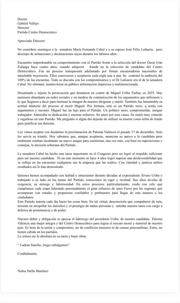 Nubia Stella Martínez, exdirectora del Centro Democrático respondió a través de una carta los señalamientos que en su contra hizo el presidente de la Federación Nacional de Ganaderos (FEDEGAN) y esposo de la senadora María Fernanda Cabal, José Félix Lafaurie, y que según el, motivaron su salida del partido uribista.