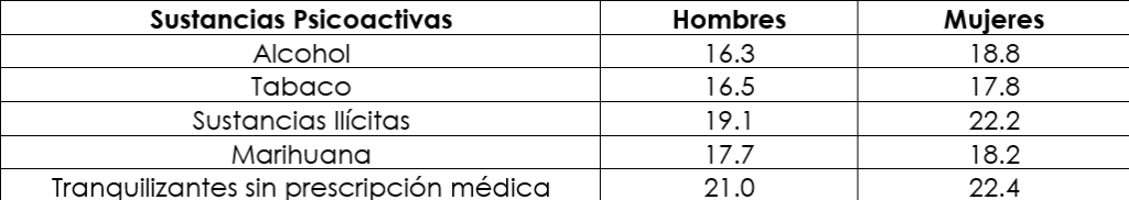 Sustancias ilícitas incluye: Dick, Popper, marihuana, cocaína, basuco, heroína, metanfetaminas y metadona sin receta médica