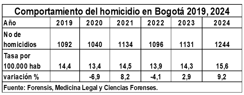 Con base en la tasa el alcalde Galán también tiene en parte la razón, cuando asegura que Bogotá tiene una de las tasas de homicidio más bajas de las ciudades capitales en lo corrido del año. Sin embargo, al presentar cifras parciales, de enero a octubre, confunde y oculta el creciente problema de violencia y delincuencia que se presenta en la ciudad, dado que en las cifras que presenta, Bogotá aparece con una tasa de 11 homicidios por cada 100.000 habitantes (ver segundo mensaje en X reseñado aquí), cuando la tasa real anual de homicidios, de acuerdo con Medicina Legal, fue de 15,6 casos por cada 100.000 habitantes en 2024 y como van las cosas es posible que este año se tenga una cifra cercana a 15. Hay que reconocer que la tasa de violencia homicida en Bogotá ha aumentado desde el año 2023 en un 12%, como se puede ver en el siguiente cuadro:
