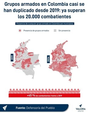 La segunda polémica en torno a la presentación de las cifras de violencia y delincuencia entre el presidente y la Defensora del Pueblo, tiene que ver con los mapas de una publicación del diario británico The Economist, en los que se muestra la presencia de grupos armados ilegales en municipios y departamentos del país entre 2019 y 2024, donde para este último año está complemente rojo, como si todo el país estuviera tomado por estos grupos.