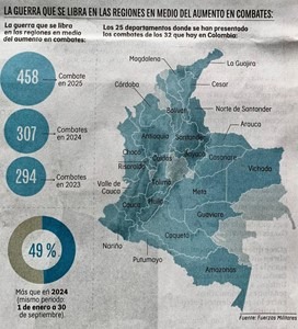 En este caso, los dos tienen la razón. Sin embargo, muchas instituciones públicas y privadas, siguen elaborando este tipo de mapas que no son tan precisos a la hora de poder determinar la verdadera dimensión del problema que se quiere presentar y que requiere solución, como se puede ver en el siguiente mapa de las Fuerzas Militares que intenta mostrar el aumento de las confrontaciones armadas en el país.