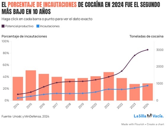 El área de cultivos de hoja no ha dejado de crecer desde 2014, llegando a 261 mil hectáreas en 2024, así como el número de toneladas de cocaína producida que llegó a 3.000 ese año[1]. De acuerdo con los datos revelados, las incautaciones en el año 2024 fueron de 29%, la cifra más baja en los últimos 10 años, como se puede ver en la siguiente gráfica: